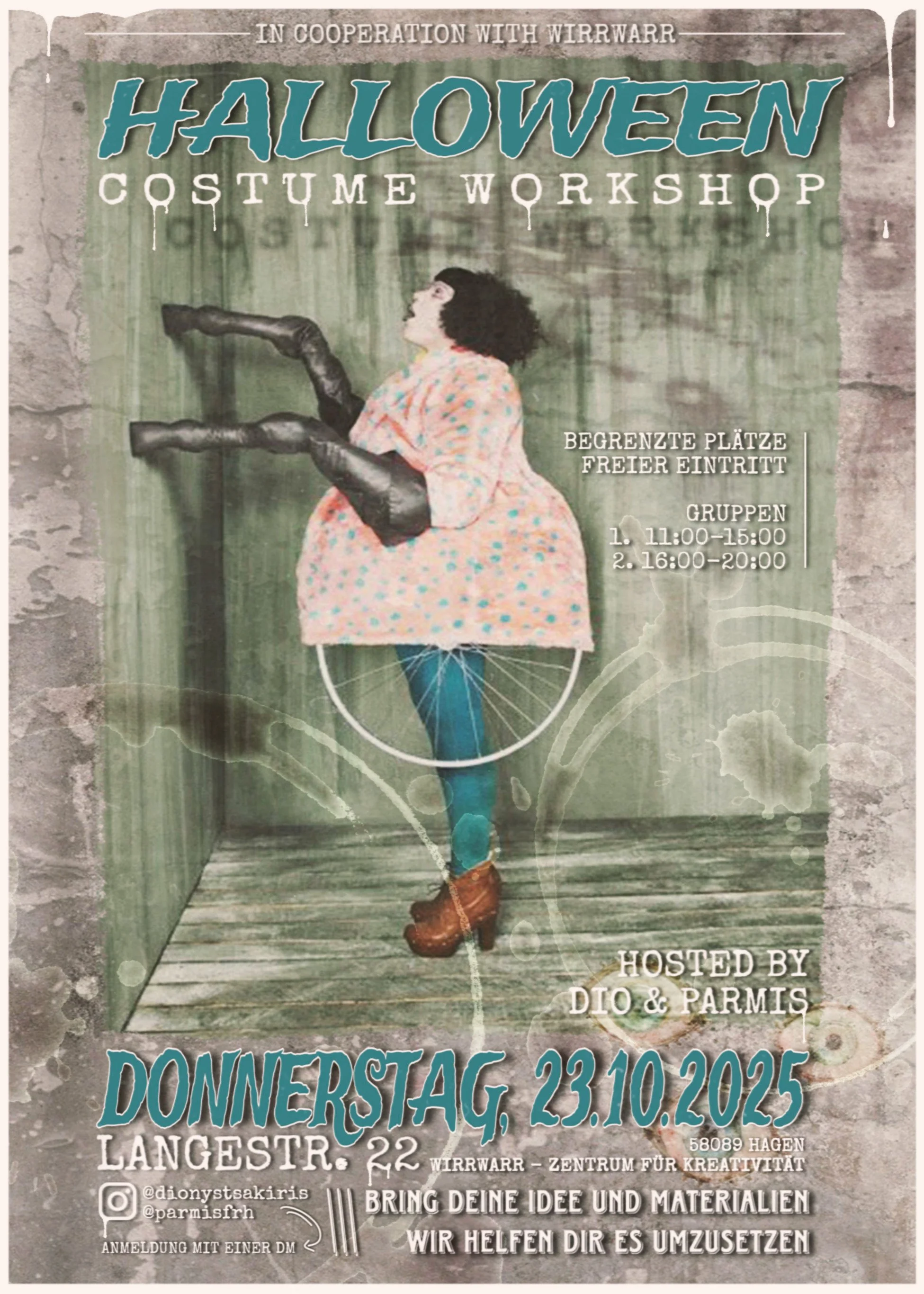 Am 23. Oktober verwandelt sich das Wirrwarr in eine Werkstatt voller Magie, Stoff & Schere. Gemeinsam mit uns, Dionys & Parmis, könnt ihr in zwei Gruppen euer ganz persönliches Halloween-Kostüm gestalten.