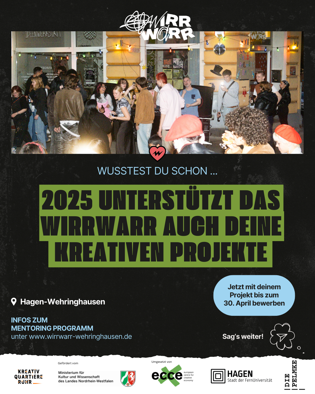 Das Mentoringprogramm ist Teil des Projektes „Kreative Vision 089 (2025)" initiiert durch das WirrWarr - Zentrum für Kreativität vom Kulturzentrum Pelmke. „Kreative Vision 089 (2025)" ist ein Projekt im Rahmen des Programms Kreativ.Quartiere Ruhr, gefördert vom Ministerium für Kultur und Wissenschaft des Landes Nordrhein-Westfalen und umgesetzt von ecce – european centre for creative economy GmbH.